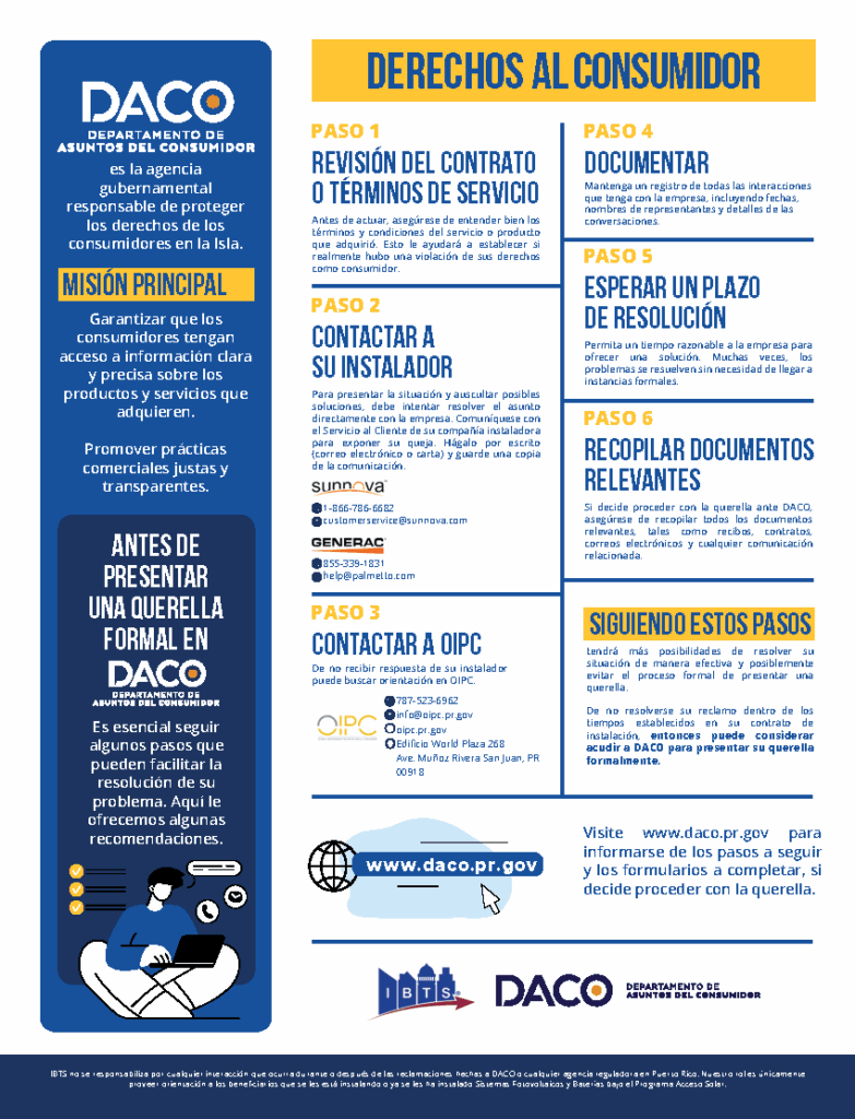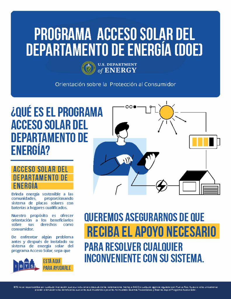 El Programa de Protección al Consumidor ofrece orientación a los participantes del Programa Acceso Solar sobre sus derechos como consumidores. Si ha enfrentado algún inconveniente antes o después de la instalación de su sistema de energía solar, IBTS está aquí para apoyarle.
