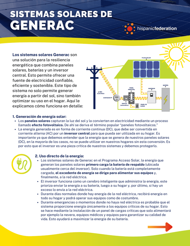 Los sistemas solares de Generac en el Programa Acceso Solar, la energía que generan los paneles solares primero carga la batería de respaldo (ubicada usualmente cerca del inversor). Solo cuando la batería está completamente cargada, el excedente de energía se dirige para alimentar sus equipos y, finalmente, a la red eléctrica.